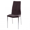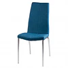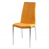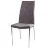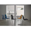 Cadeira estofada para sala de jantar em cor cinza claro com estrutura em aço e perna colorida cromada. Design simples, é uma cadeira forte e robusta devido à composição de seus materiais.