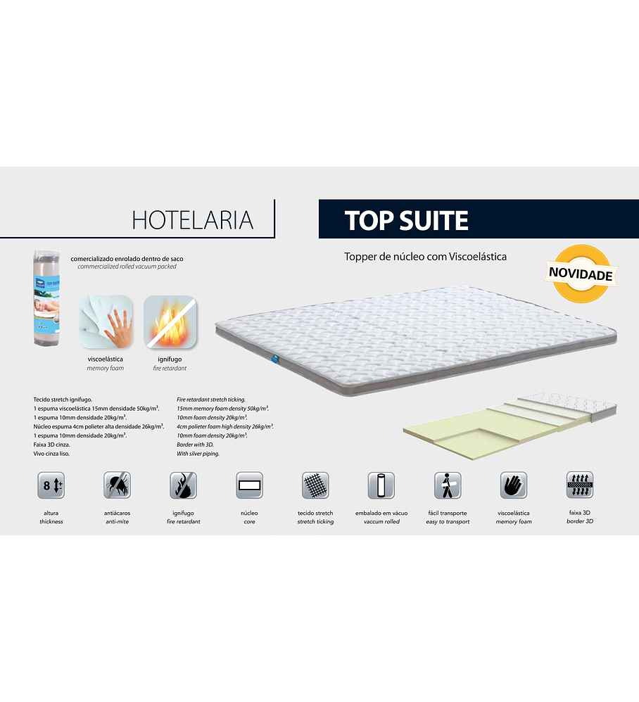 Altura -+ 8 Cm / stretch ignífugo / antiácaros / antialérgico / anatómico / faixa 3D / fácil transporte / embalado em vácuo / viscoelástica